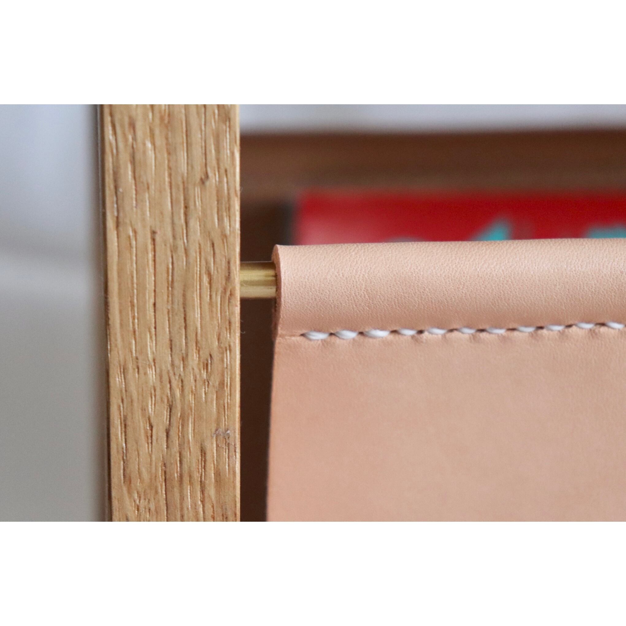 オーク材(無垢)、真鍮棒、ヌメ革